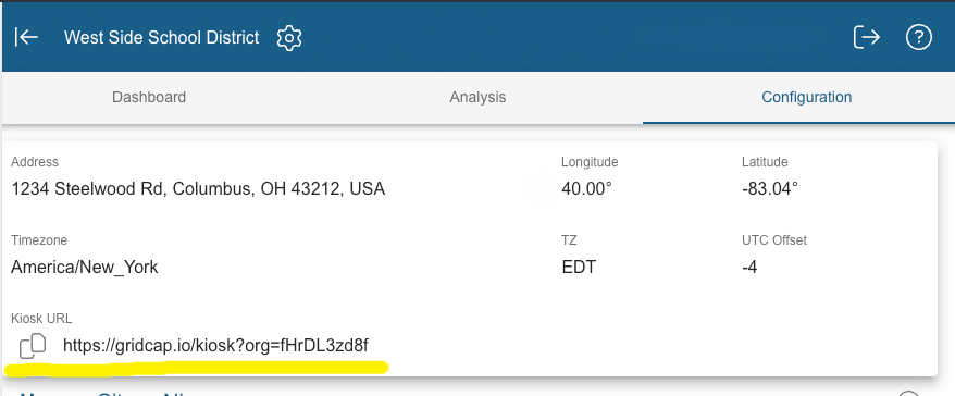 All users can find the kiosk URL of an organization in the Organization Dashboard, Configuration tab. Click on the copy icon to copy the kiosk URL to your clipboard.